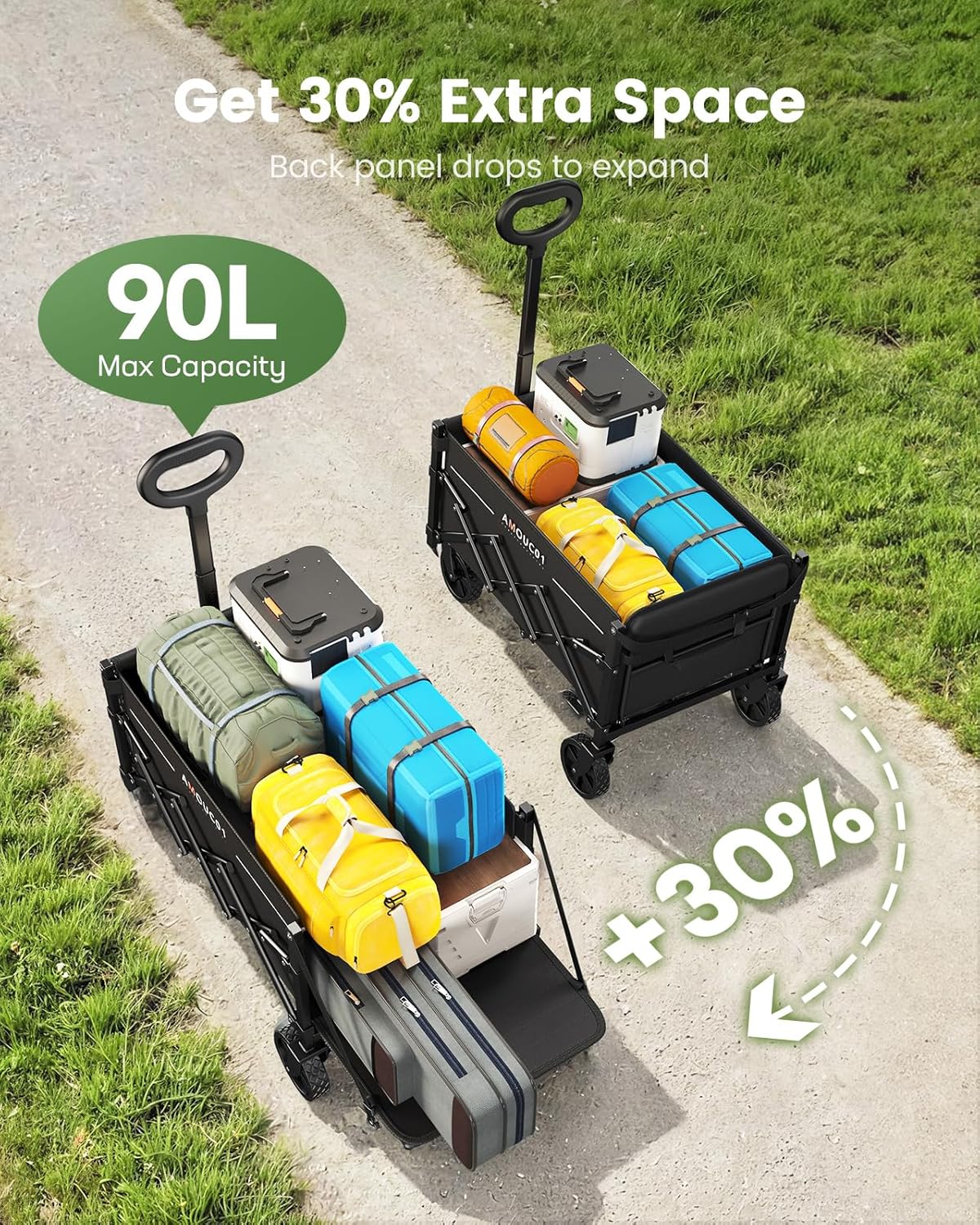 Ein besonderes Highlight ist die erweiterbare Ladekapazität. Durch das Absenken der Rückwand vergrößert sich das Fassungsvermögen um beeindruckende 30 % – ideal für sperrige Gegenstände wie Surfbretter, lange Werkzeuge oder große Kühltaschen. Diese clevere Funktion macht den Wagen noch vielseitiger, ohne dass zusätzlicher Aufwand entsteht.