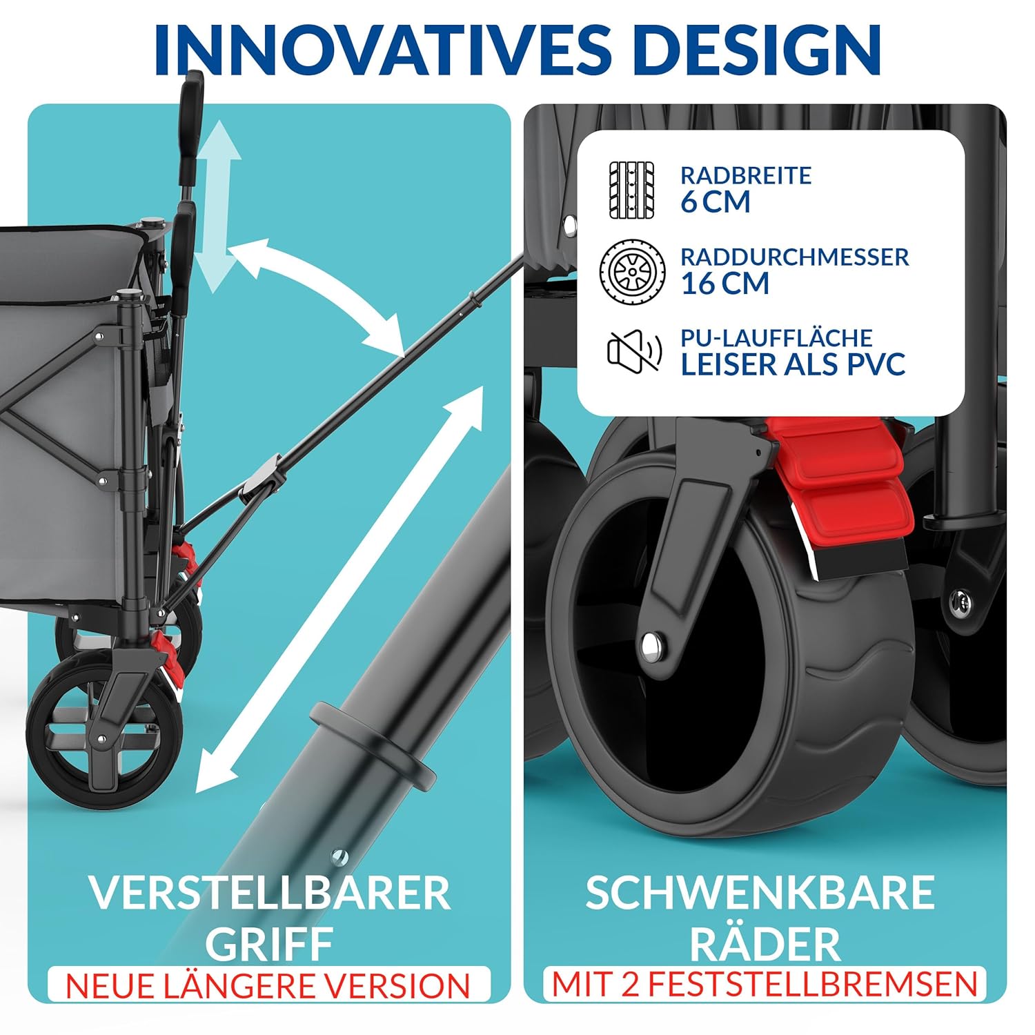 Besonders überzeugend: das integrierte wetterfeste Dach aus hochwertigem, regenfestem Stoff, das Ihre Ladung zuverlässig vor Nässe, Sonne und neugierigen Blicken schützt. Zusammen mit dem stabilen Stahlrahmen, den 360°-schwenkbaren Rädern mit Fußbremse und dem ergonomischen, teleskopierbaren Griff (bis 110 cm ausziehbar) entsteht ein Transportmittel, das Sicherheit, Komfort und Langlebigkeit in einem eleganten Design vereint. Ob auf matschigen Festivalwegen, sandigen Strandpfaden oder glatten Supermarktfluren – dieser Handwagen meistert jede Situation mit Leichtigkeit.