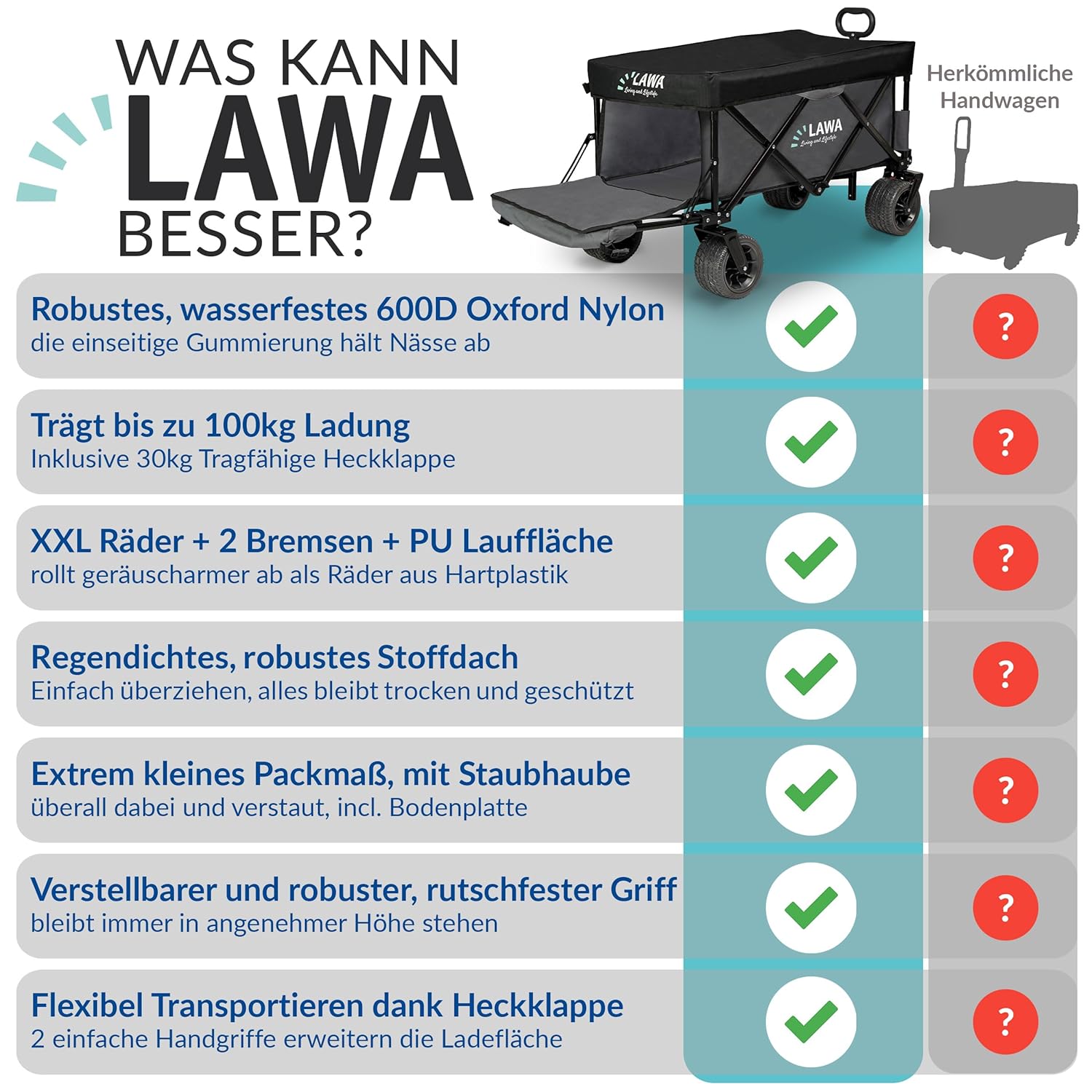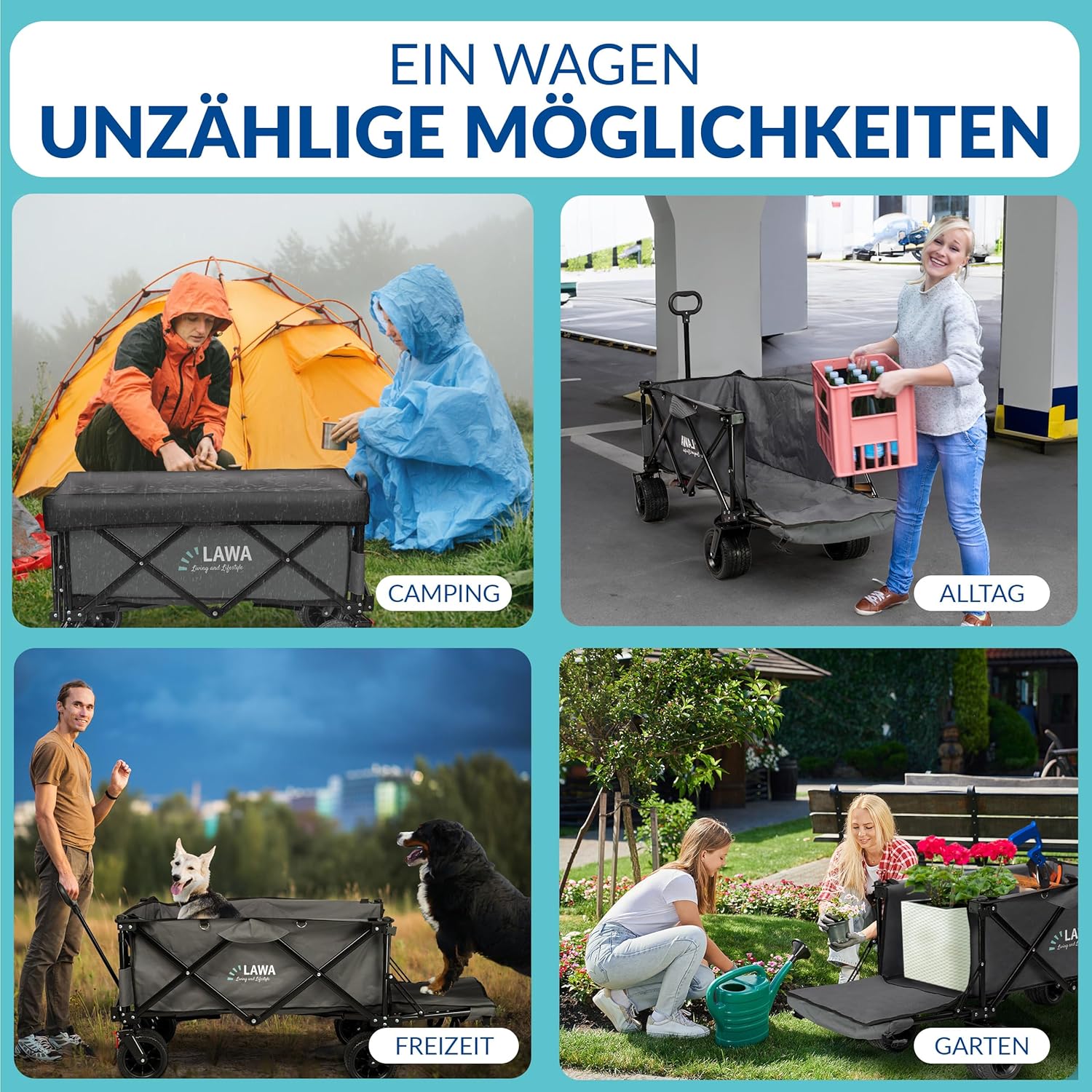 Mit dem faltbaren Handwagen mit Dach von LAWA Living and Lifestyle investieren Sie in ein langlebiges, vielseitiges und durchdachtes Produkt, das Ihren Alltag erleichtert und Freizeitaktivitäten komfortabler macht. Ob beim wöchentlichen Einkauf, beim Strandurlaub mit der Familie, beim Garteneinsatz oder beim Campingabenteuer – dieser Wagen ist immer bereit, zuverlässig und stabil zu unterstützen. Entdecken Sie die Freiheit, mehr transportieren zu können – mit weniger Aufwand und mehr Spaß. Dieser faltbarer Rollwagen mit 4 Rädern bietet nicht nur eine einfache Handhabung, sondern auch eine hohe Tragfähigkeit, die es Ihnen ermöglicht, selbst schwere Lasten mühelos zu transportieren. Zudem lässt sich der Wagen kompakt zusammenfalten, sodass er problemlos in Ihrem Kofferraum oder Ihrer Garage verstaut werden kann. Die robusten Materialien gewährleisten Langlebigkeit, während das moderne Design garantiert, dass Sie stets stilvoll unterwegs sind.