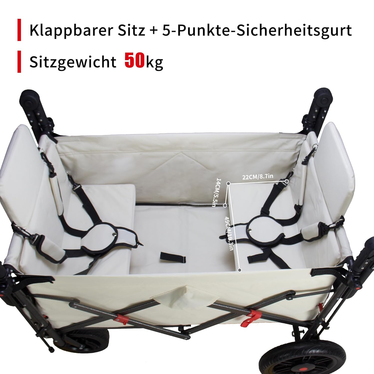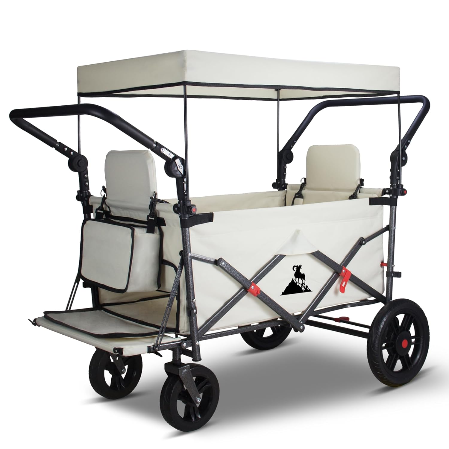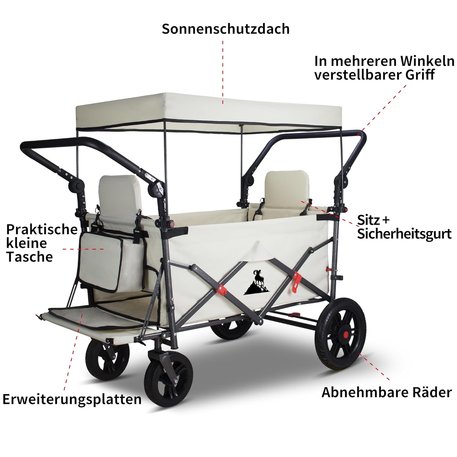 Dieser faltbare Handwagen ist nicht auf eine einzige Aufgabe beschränkt – er ist ein wahres Multitalent im täglichen Einsatz. Für Familien wird er schnell zum unverzichtbaren Helfer: ob beim Transport von Einkäufen aus dem Supermarkt, beim Tragen von Picknickzubehör zum Park oder beim sicheren Transport von Kinderspielzeug zum Strand. Die beiden integrierten Sitze mit Fünf-Punkt-Sicherheitsgurten ermöglichen es, Kinder sicher und bequem zu befördern, während die Eltern den Wagen bequem schieben oder ziehen.