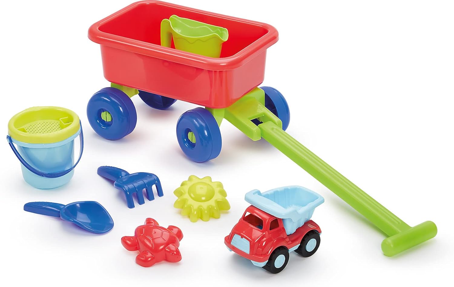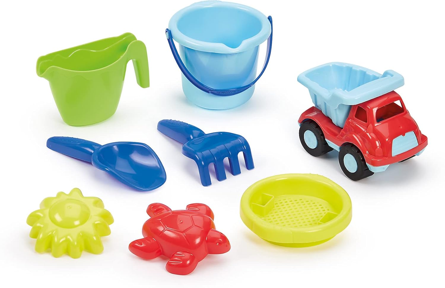 - Komplett-Set für Strand- und Sandspiel: Enthält Sandeimer (10 cm), Sieb, Gießkanne, 2 Sandformen, Schaufel, Rechen und kippbares Fahrzeug