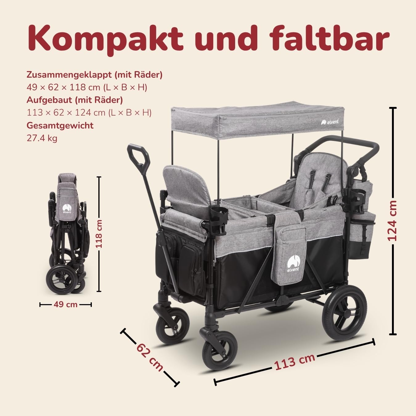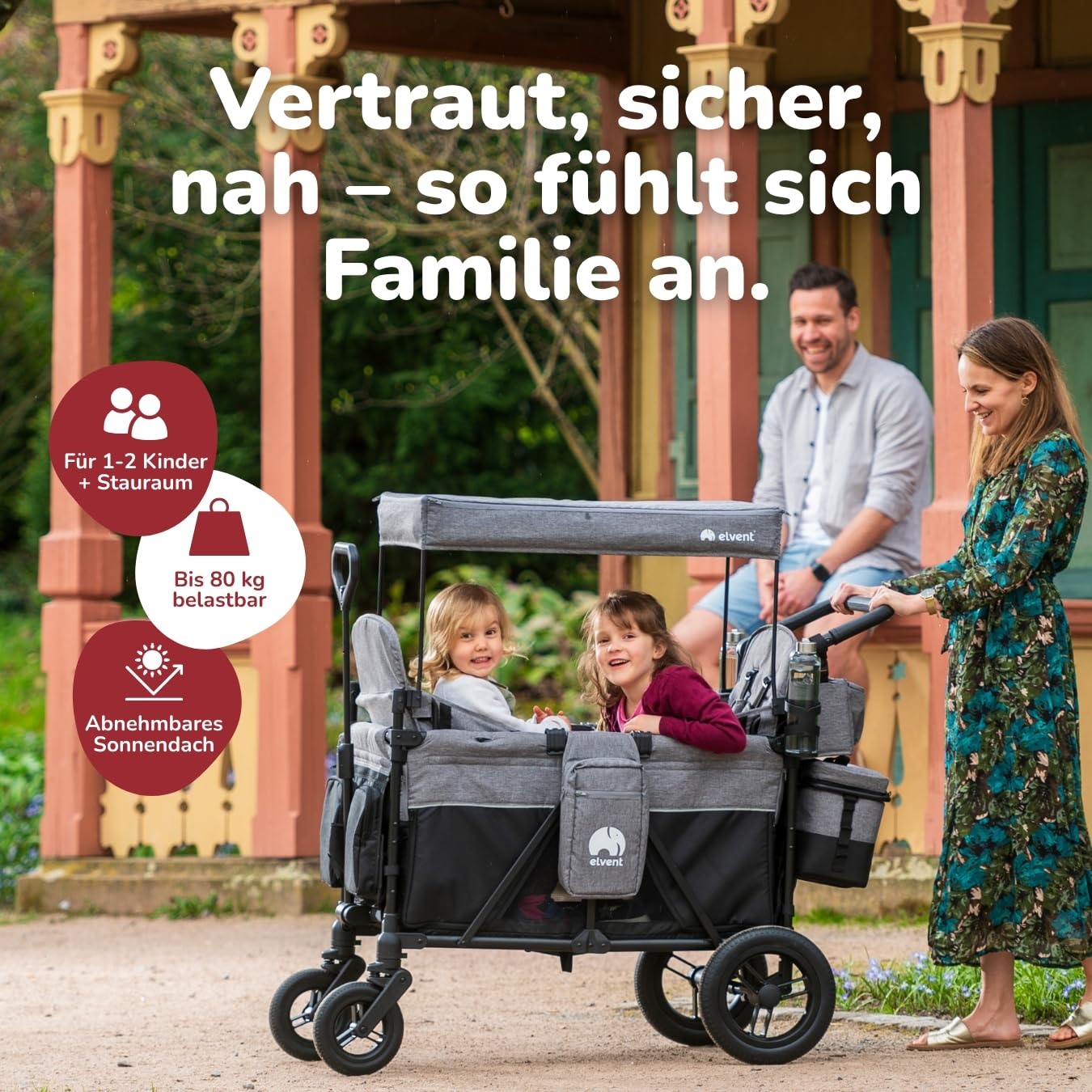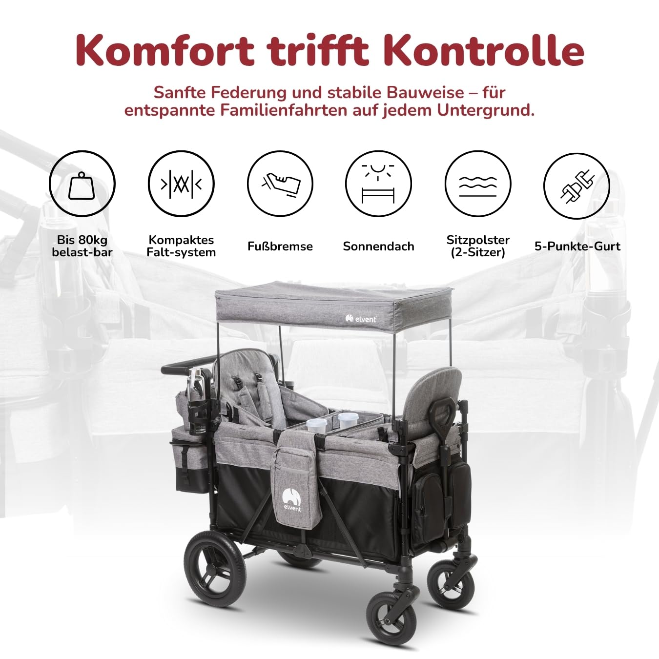 Familienabenteuer beginnen bereits im Alltag – beim Einkauf, beim Spaziergang durch den Park oder auf dem Weg zum Wochenmarkt. Doch allzu oft wird der Ausflug mit Kindern zur Herausforderung: müde Beine, ungemütliches Wetter, zu viel zu tragen und der ständige Kampf um Sicherheit und Komfort. Mit dem elvent® ComfortPlus 2 Seater Handcart präsentiert elvent eine durchdachte, hochwertige Lösung, die Familienmobilität neu definiert. Dieser faltbare Kinderroller vereint erstklassige Verarbeitung, intelligenten Stauraum und umfassenden Schutz in einem zeitlosen, grauen Design.
