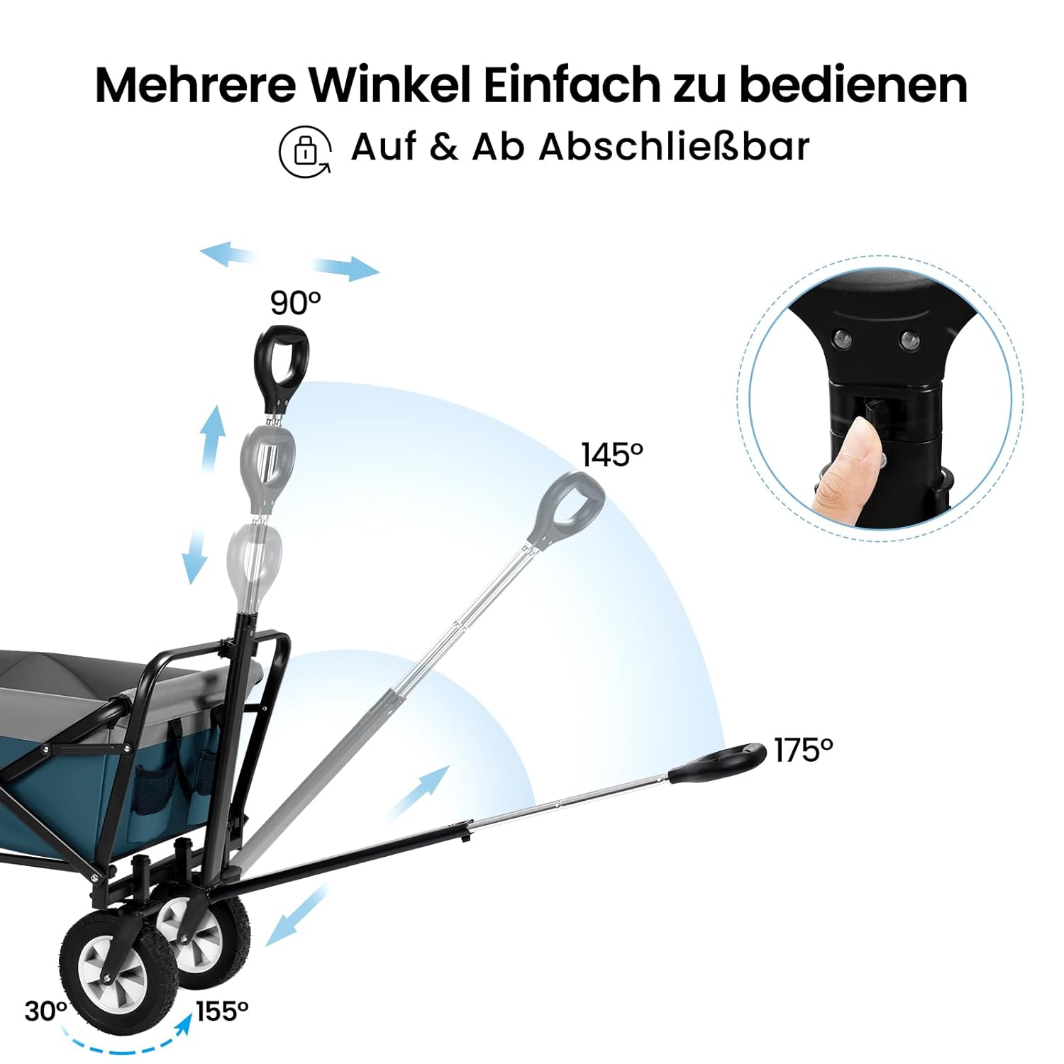 Die Kanten des Rahmens sind abgerundet und verletzungsfrei gestaltet – besonders wichtig bei Familien mit kleinen Kindern, die oft neugierig um das Gerät herumtoben. Auch beim Beladen und Entladen bleibt der Wagen standfest: Er kippt nicht um, wenn Sie Gegenstände von einer Seite einladen. Die Verriegelungsmechanismen des Faltgestänges arretieren sicher und lassen sich nur durch gezieltes Betätigen lösen – so bleibt der Wagen auch bei holprigen Wegen stabil.