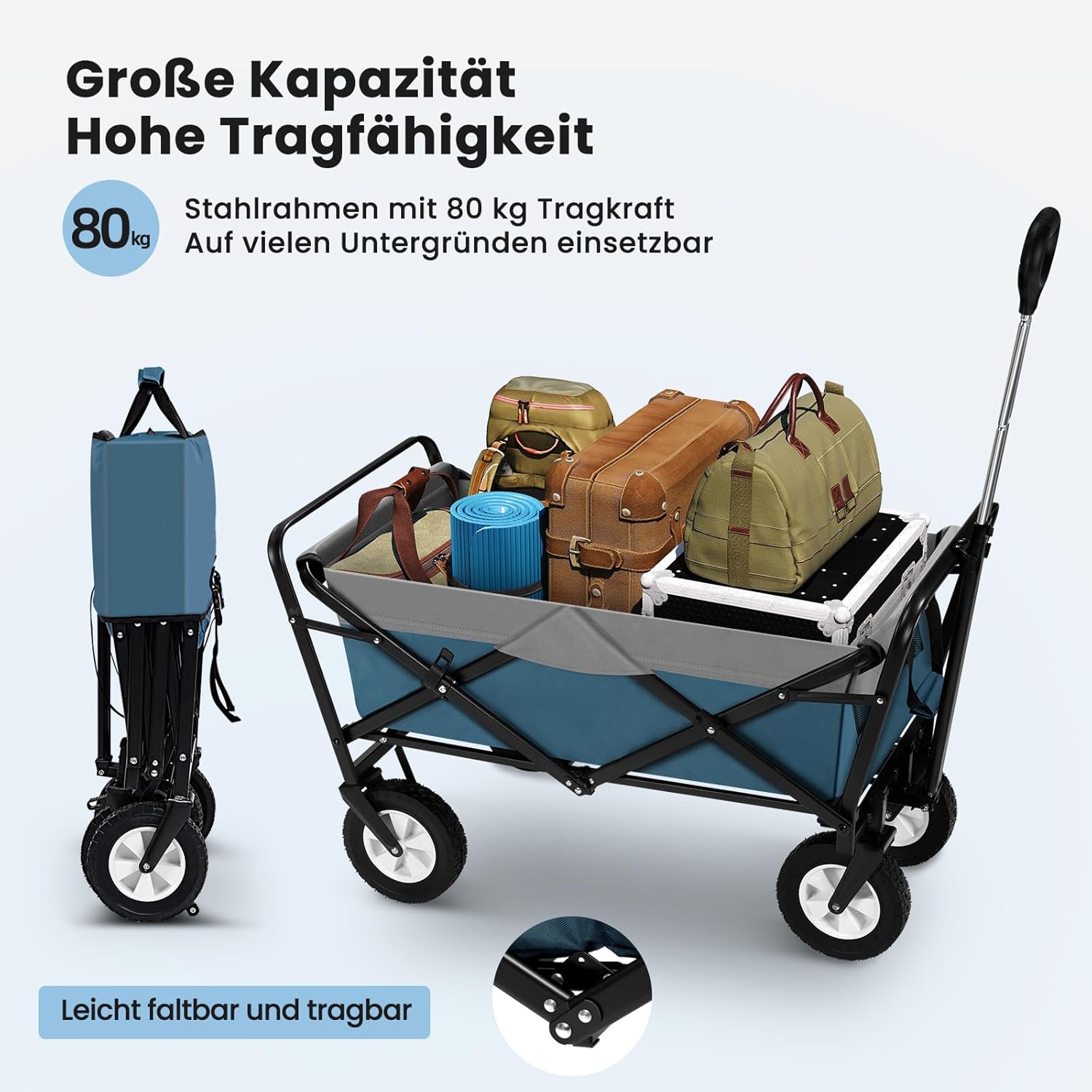 Die Tragfähigkeit von 80 kg ist kein theoretischer Wert, sondern wurde in der Praxis erprobt. Ob Sie mehrere Getränkekisten, schwere Werkzeuge oder nasse Strandtücher transportieren – der Wagen hält, was er verspricht. Die Lastverteilung ist dank der stabilen Grundfläche ausgezeichnet, und der Schwerpunkt liegt tief, was das Kippen verhindert. Selbst bei voller Beladung bleibt das Fahrverhalten sicher und leichtgängig.