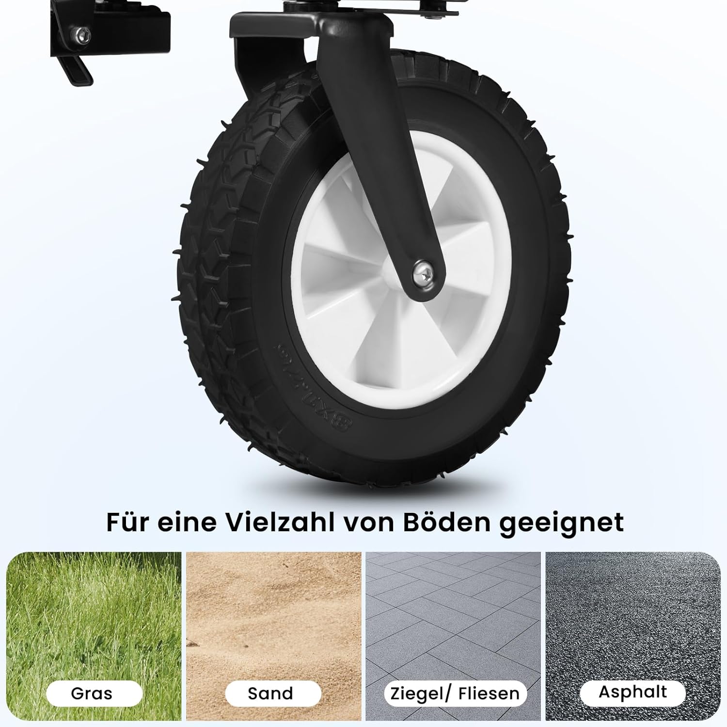 Die Räder haben einen ausreichenden Durchmesser, um auch kleinere Unebenheiten wie Fugen, Äste oder Kiesflächen problemlos zu überwinden. Gleichzeitig sind sie nicht so groß, dass sie das platzsparende Falten behindern würden. Die Bodenfreiheit ist ausgewogen dimensioniert, sodass der Wagen weder hängen bleibt noch kippelig wirkt. Die Lenkung der Vorderräder erfolgt sanft und präzise – Sie können den Wagen eng um Hindernisse herumführen, ohne ihn abstellen zu müssen.