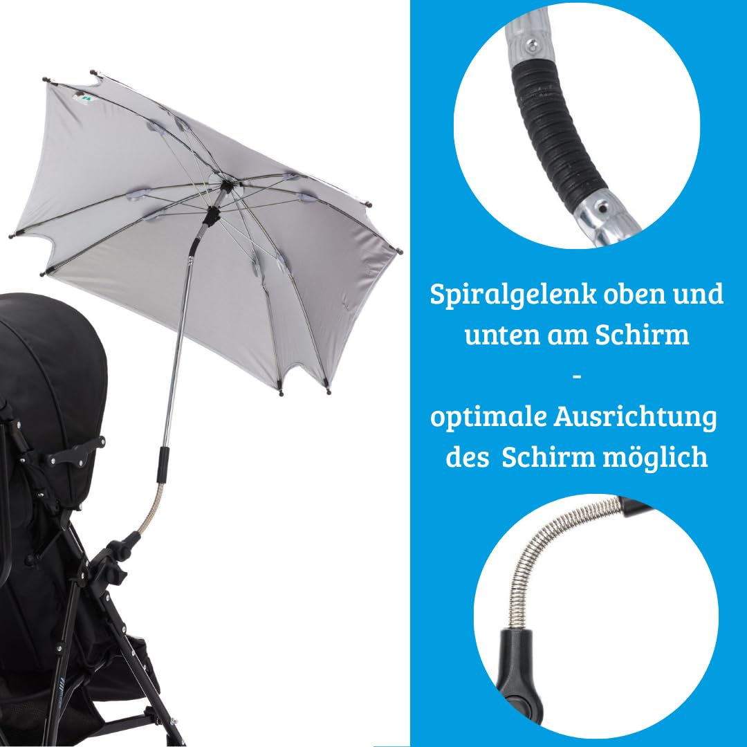 Doch seine Anwendungsmöglichkeiten enden nicht beim Kinderwagen. Viele Eltern schätzen den Parasol auch für den Einsatz an Rollstühlen, Campingstühlen oder sogar an Kinderfahrrädern mit Anhängern. Gerade bei langen Aufenthalten im Freien – sei es beim Picknick im Grünen, beim Warten auf den Arzttermin im Garten oder beim Besuch von Märkten und Festivals – schafft der 85 cm durchmessende Schirm eine großzügige Schattenfläche, die ausreichend Platz für Kopf, Gesicht und Oberkörper Ihres Kindes bietet. Selbst bei seitlich einfallendem Sonnenlicht bleibt der Schutz wirksam, da der flexible Haltearm individuell justiert werden kann, um den optimalen Winkel einzunehmen.