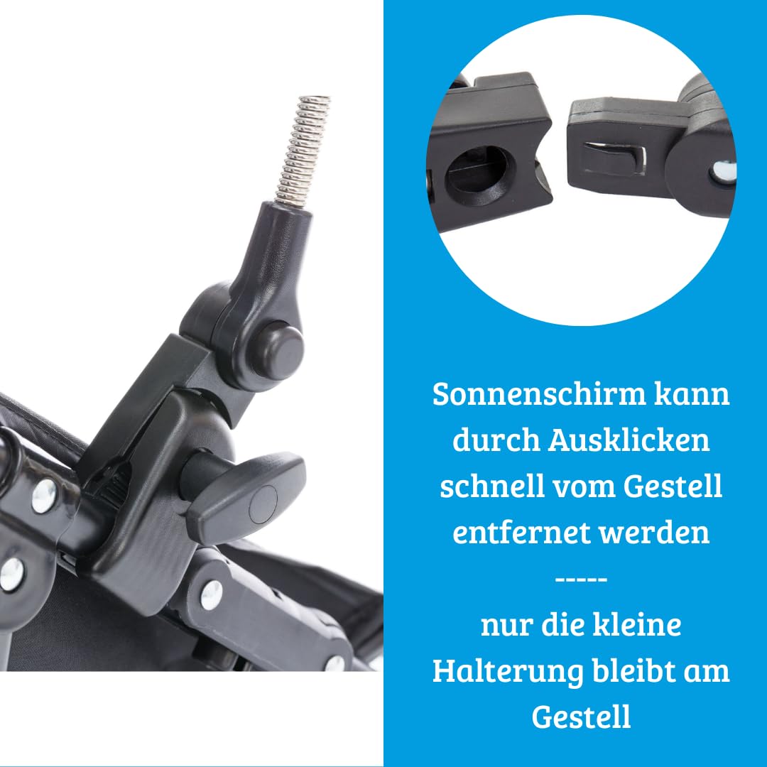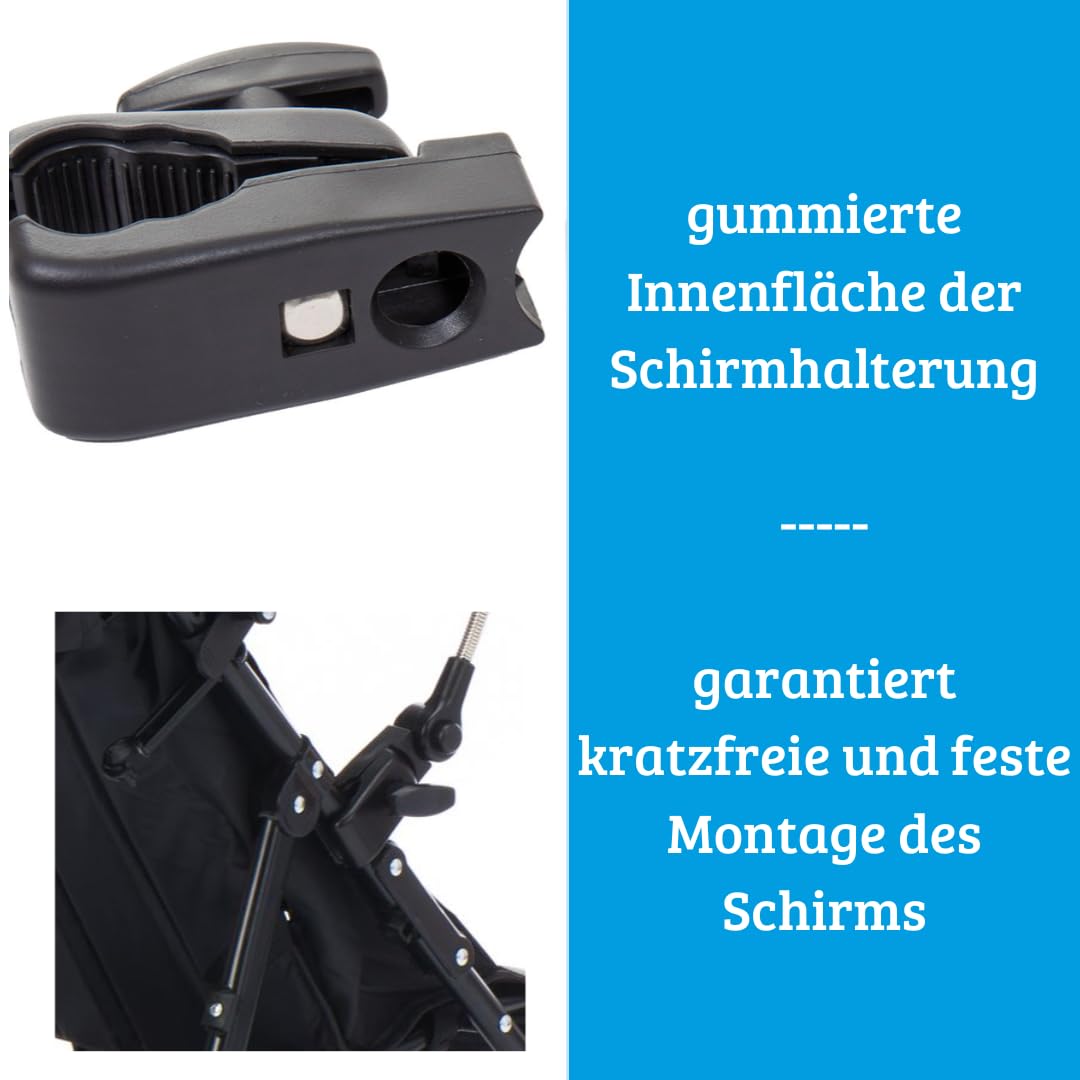 Die Klemmhalterung, das Herzstück des universellen Designs, besteht aus einem formschlüssigen Kunststoffverbund mit integrierten Gummieinlagen. Diese sorgen für einen sicheren Halt am Kinderwagentubus, ohne diesen zu beschädigen. Das System arbeitet ohne Werkzeug – ein einfaches Aufschieben und Zudrehen des Klemmhebels genügt, um den Parasol fest zu verankern. Gleichzeitig lässt sich die Halterung bei Bedarf schnell lösen, sodass der Schirm innerhalb von Sekunden auf ein anderes Gefährt ummontiert werden kann.