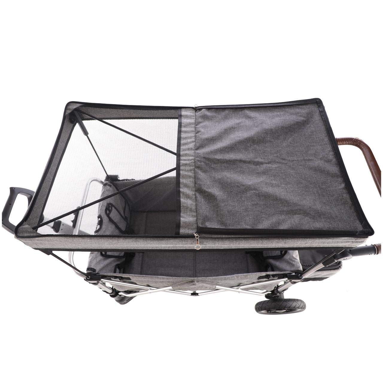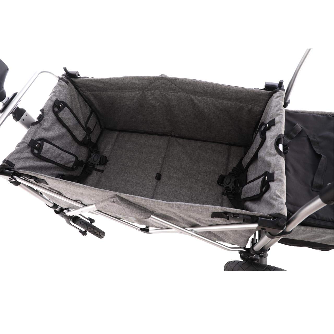 Trotz seines kompakten Faltformats bietet der Handwagen eine beeindruckende Innenraumgröße von 80 cm x 47 cm x 38 cm – mehr als ausreichend, um zwei Kinder oder umfangreiches Gepäck bequem zu transportieren. Der Laderaum ist tief, breit und seitlich gut geschützt, sodass nichts verrutschen kann.