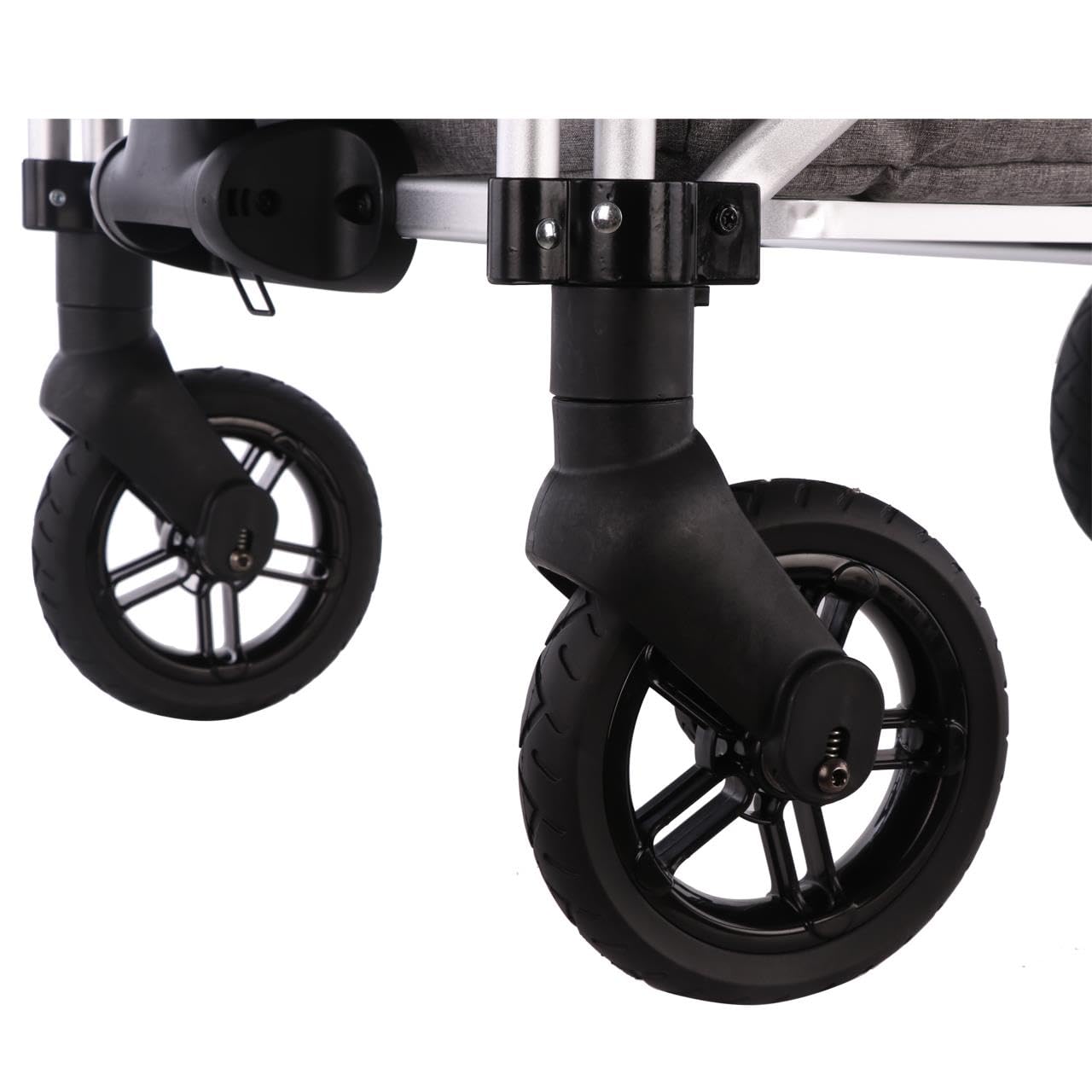 Die stabile Bauweise des Aluminiumrahmens trägt zusätzlich zur Sicherheit bei. Durch den tiefen Schwerpunkt und die breite Spur neigt der Wagen nicht zum Kippen, auch wenn er beladen ist. Die Reifen mit Vollprofil bieten hervorragenden Grip auf nassem oder glattem Untergrund – ein entscheidender Vorteil bei regnerischem Wetter.