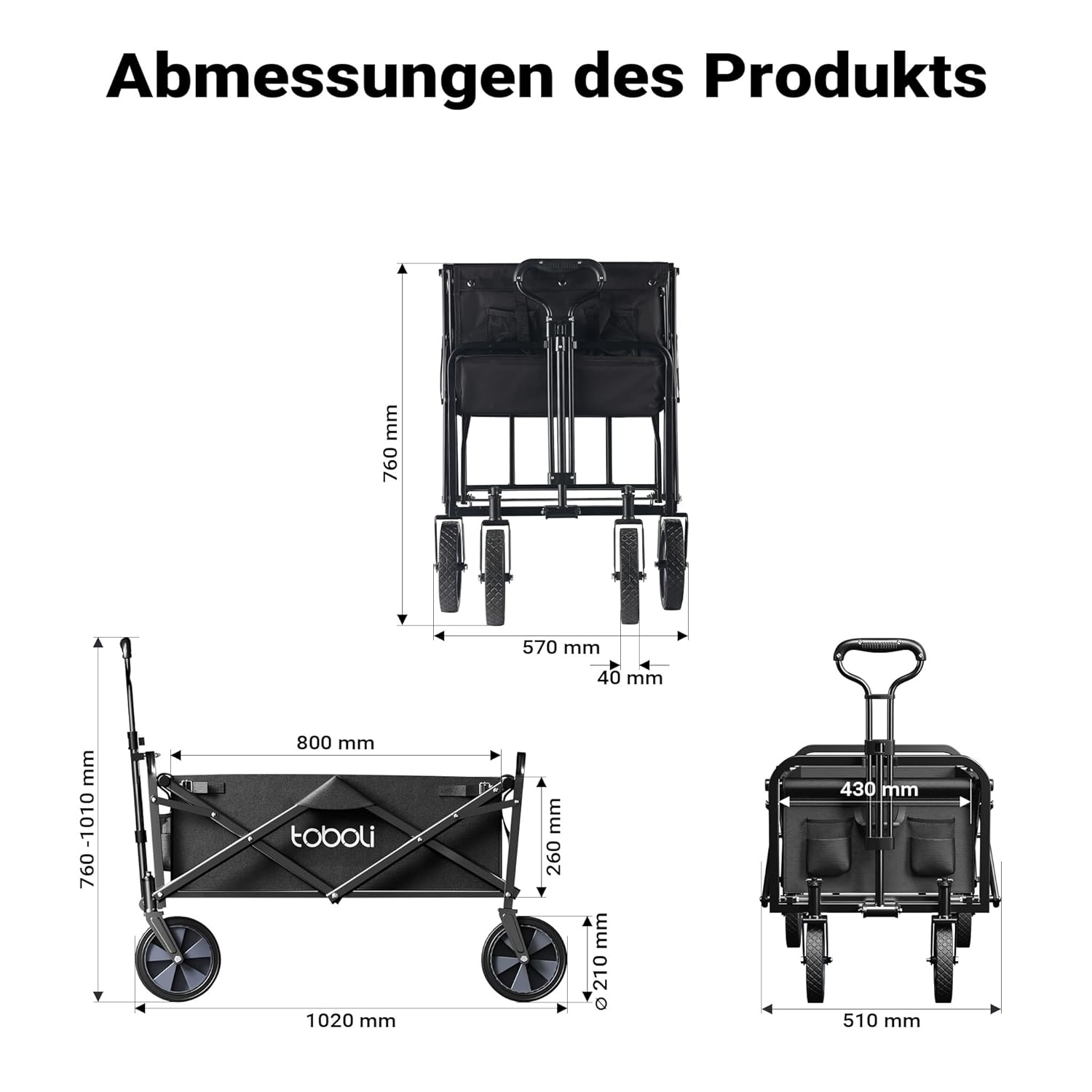 Entwickelt für Menschen, die Wert auf Qualität, Sicherheit und Flexibilität legen, verbindet der Toboli Handcart das Beste aus zwei Welten: maximale Belastbarkeit und minimale Aufbewahrung. Er passt problemlos in jeden Kofferraum, lässt sich in Sekundenschnelle auf- und zuklappen und steht immer dann bereit, wenn Sie ihn brauchen. Ob Sie schweres Gartengerät zur Schrebergartenparzelle bringen, einen kompletten Wochenendeinkauf nach Hause transportieren oder das gesamte Campingzubehör für die Familie schleppen – dieser Handwagen macht jede Herausforderung zum Kinderspiel.