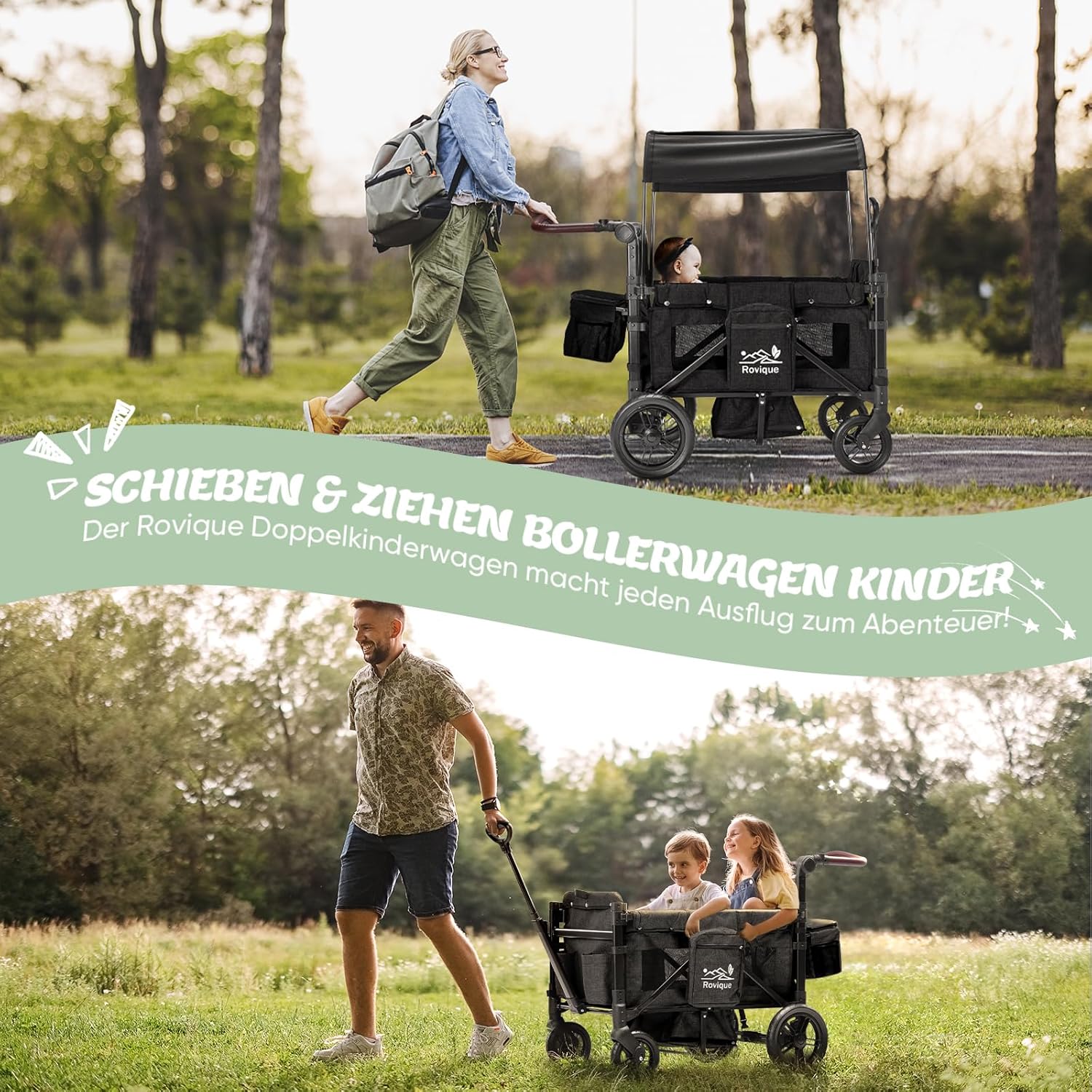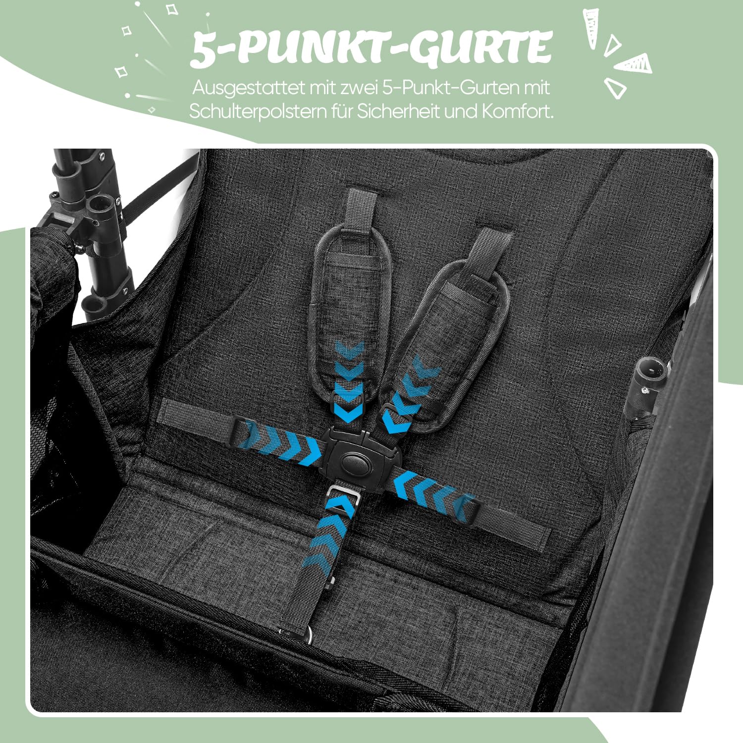 Handcart Foldable mit verstellbarem Sonnencanopy – 2-Sitzer Kinderwagen mit 5-Punkt-Gurt, höhenverstellbarem Griff, Schiebefunktion, PU-Rädern mit Bremse, Stauraum & mehr – Der ideale Begleiter für aktive Familien