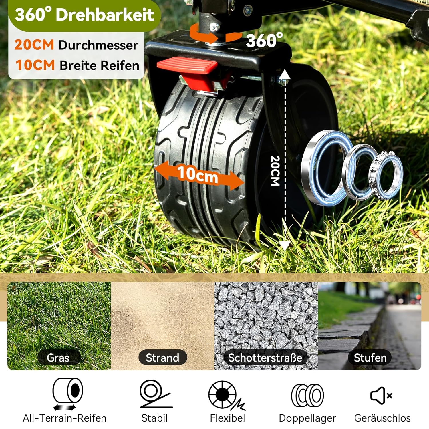 - Reifen: Breite All-Terrain-Bereifung, 360° drehbare Vorderräder
