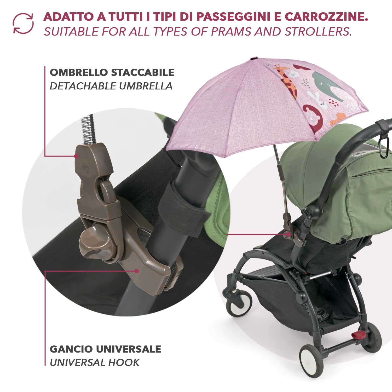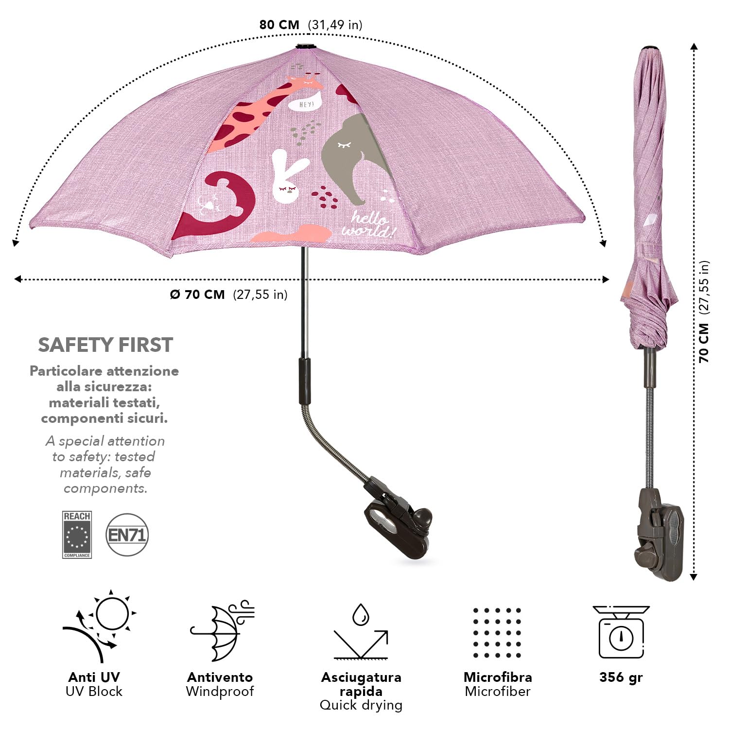 Optisch setzt der Parasol charmante Akzente: In zarten Pastellfarben gehalten, zieren liebevoll gezeichnete Tiere das Design – darunter ein verspielter Hase, ein freundlicher Elefant, eine neugierige Giraffe und ein mutiger Löwe. Diese Motive wecken die Fantasie der Kleinsten und werden im Laufe der Zeit zu vertrauten Begleitern auf zahlreichen Entdeckungstouren. Das dezente Farbschema fügt sich harmonisch in jede Alltagsatmosphäre ein und unterstreicht den hochwertigen Eindruck des Produkts.
