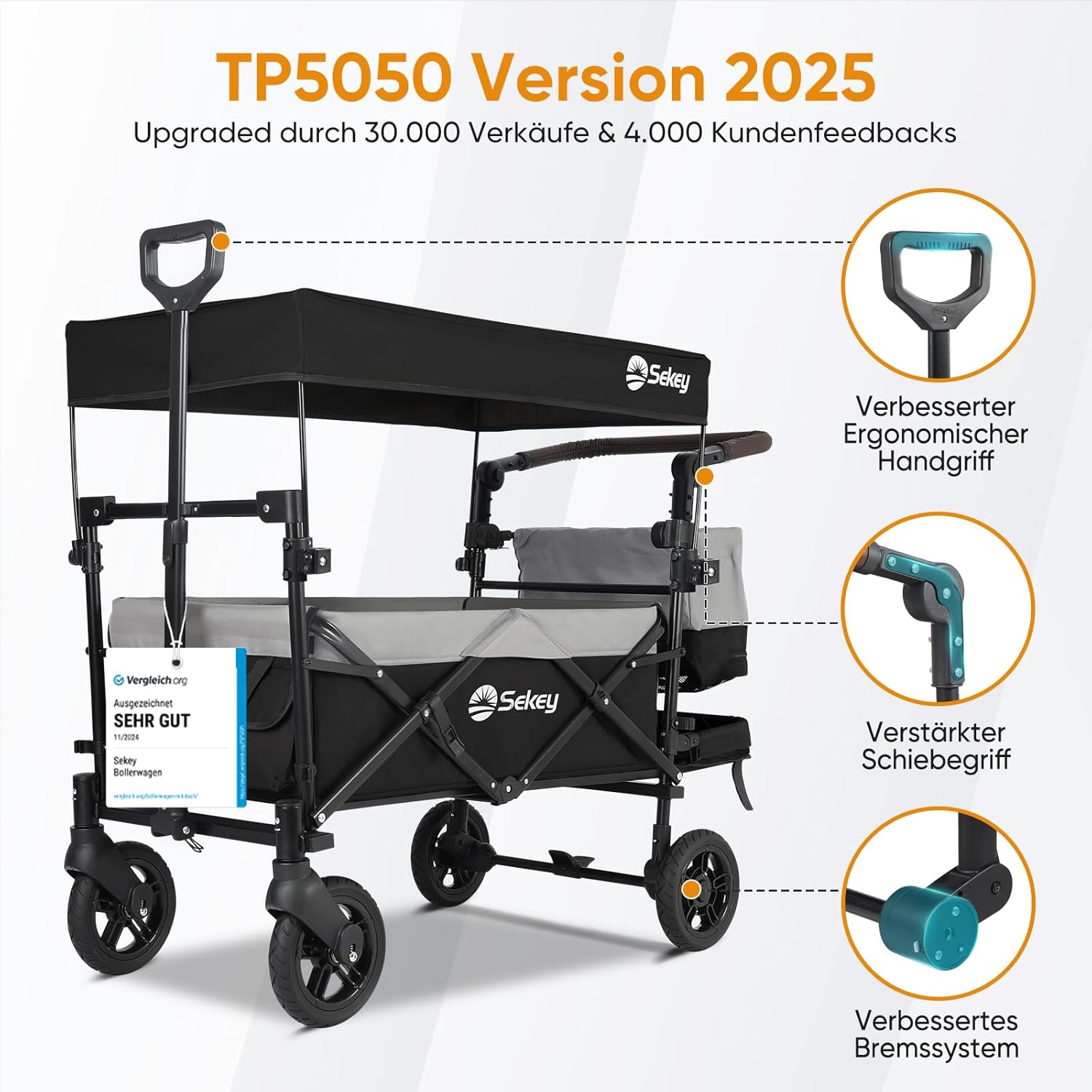 Der Sekey TP5050 ist mehr als nur ein Bollerwagen – er ist ein verlässlicher Begleiter für die schönsten Momente des Familienlebens. Mit seiner Kombination aus Sicherheit, Komfort, Langlebigkeit und Alltagstauglichkeit schafft er Freiraum für gemeinsame Erlebnisse, ohne Kompromisse einzugehen. Investieren Sie in ein Produkt, das mitwächst, aushält und jedes Abenteuer mit Ihnen teilt.