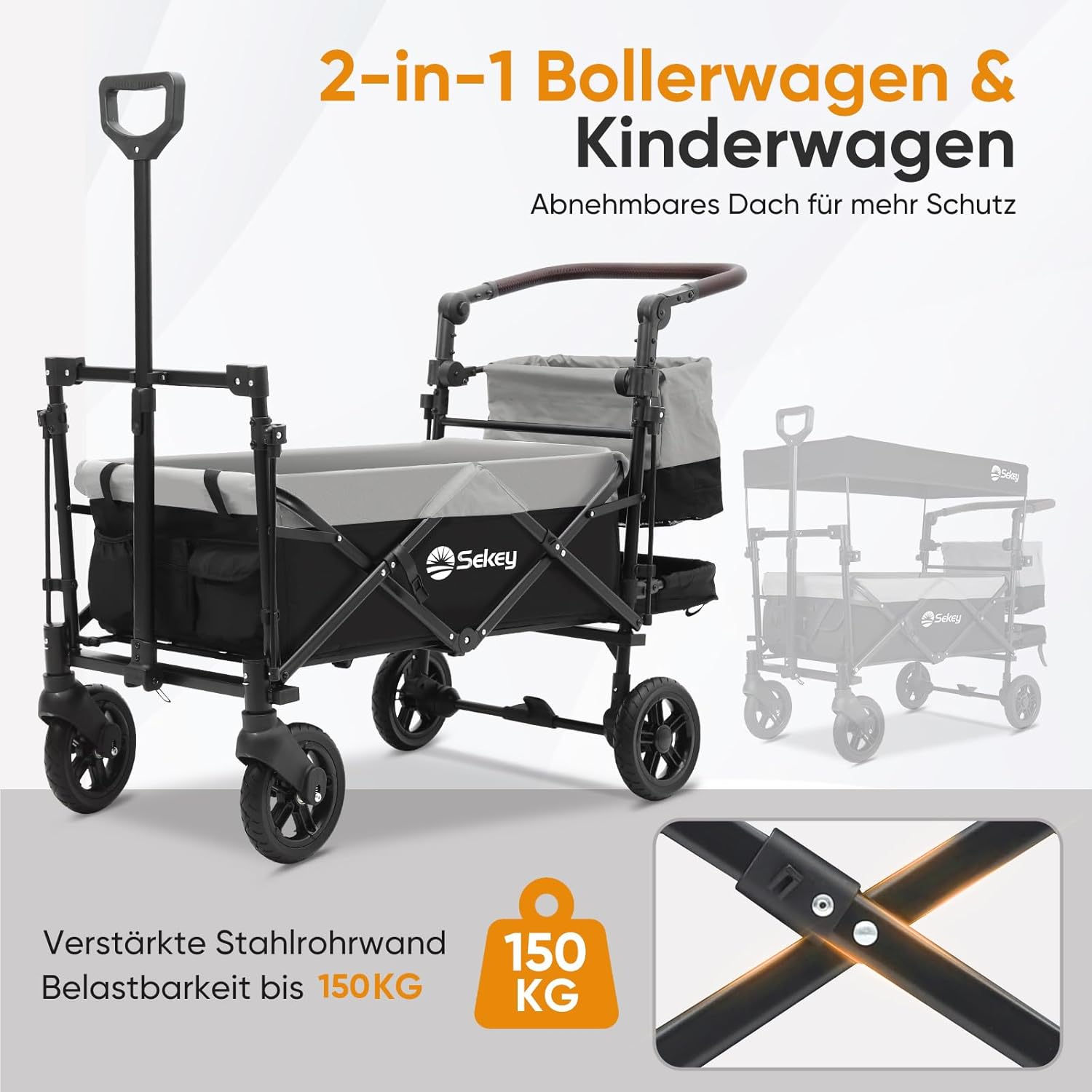 Sekey TP5050 Klappbarer Bollerwagen für Kinder – Robuster Begleiter mit 150 kg Tragfähigkeit, Schiebegriff und Bremssystem, Schwarz mit Grau