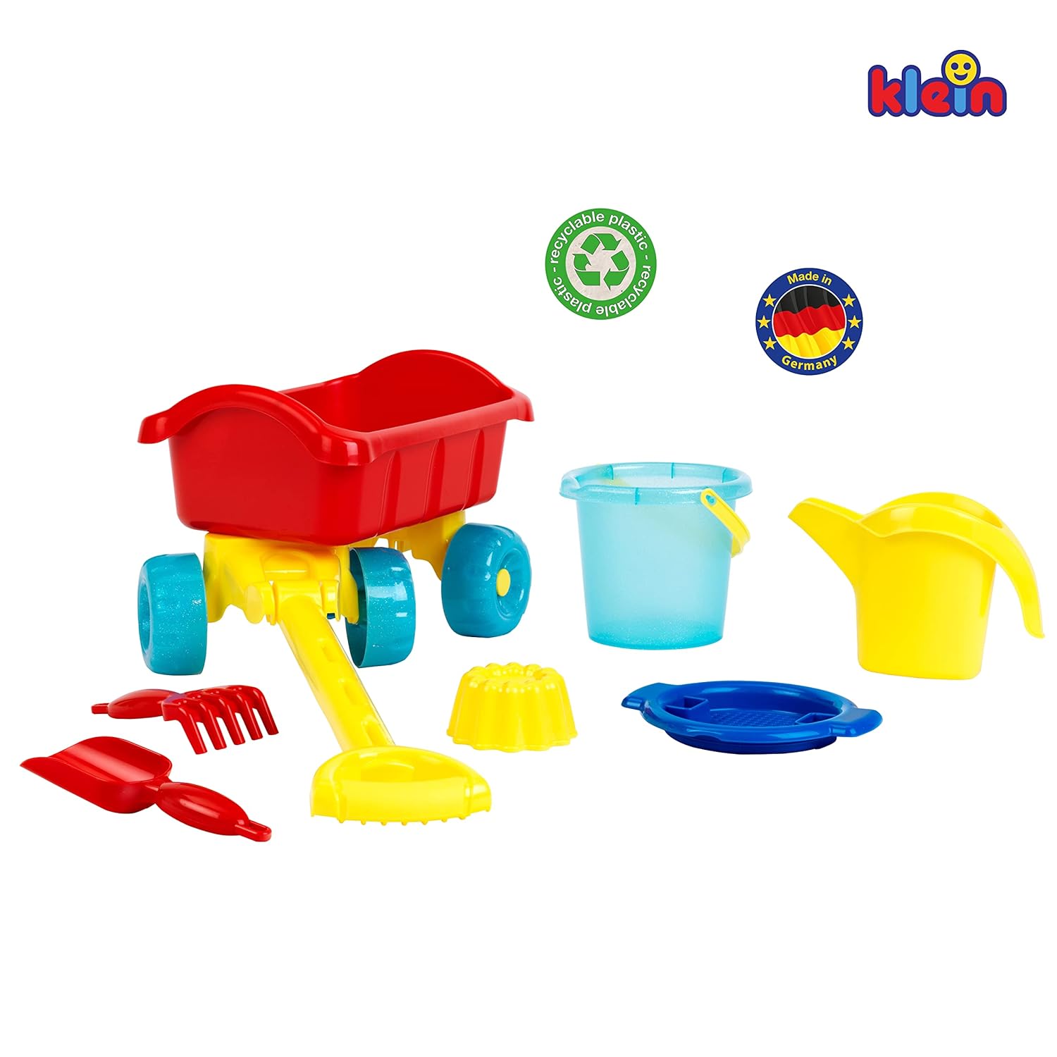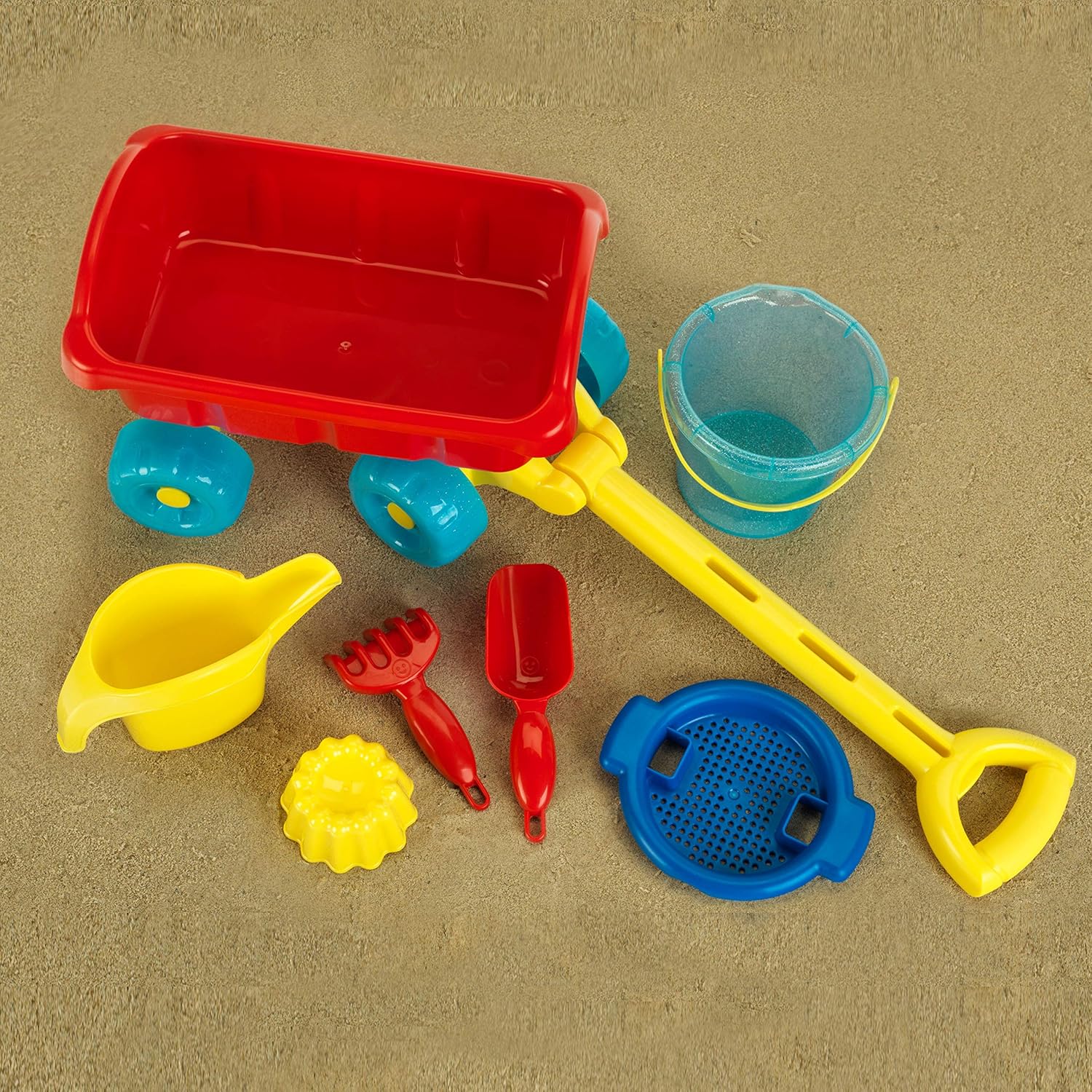 - Sechs hochwertige Einzelelemente im Set: Handwagen, Sandeimer, Schaufel, Harke, Sieb und zwei kleine Eimer