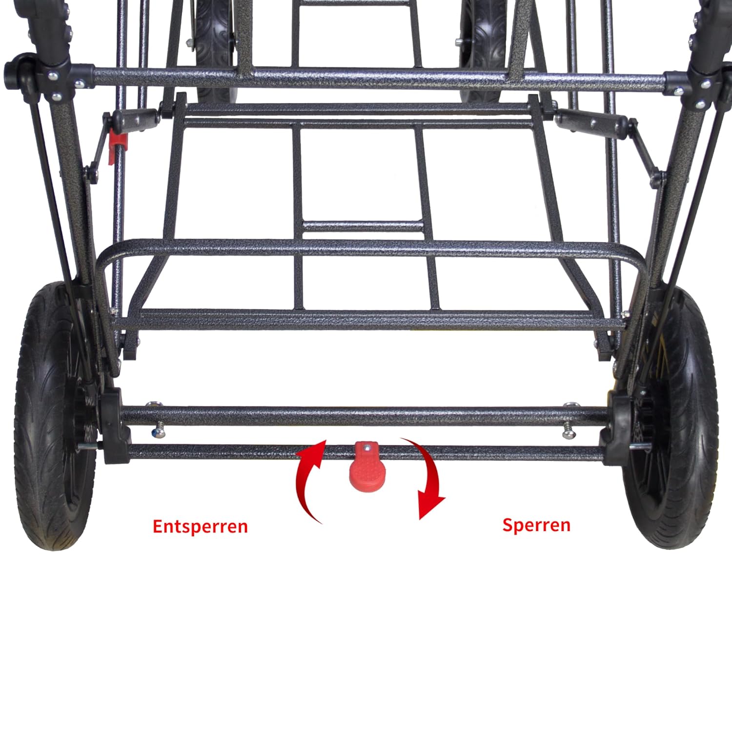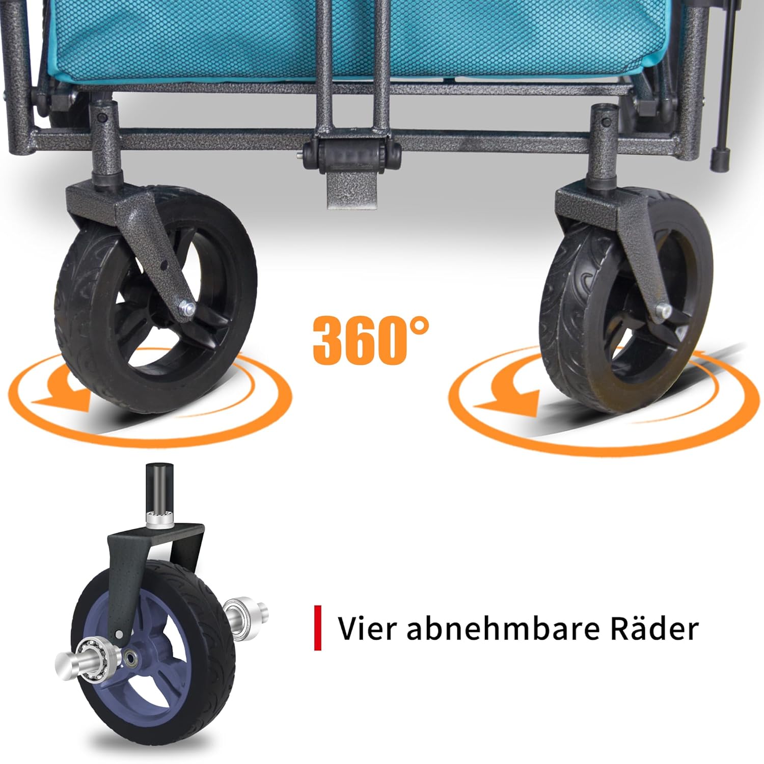 Ein besonderes Highlight ist die 360-Grad-Schwenkfront. Das vordere Rad lässt sich vollständig drehen, wodurch der Wagen äußerst wendig wird – ideal für enge Gassen, volle Supermarktregale oder dicht bewachsene Campingplätze. Im Vergleich zu starren Vorderrädern reduziert dies den Kraftaufwand beim Lenken erheblich und macht das Manövrieren zu einem Kinderspiel. Gleichzeitig sorgt die Achsaufhängung für ausreichend Nachgiebigkeit, sodass Unebenheiten im Untergrund ausgeglichen werden, ohne dass die Ladung ins Rutschen gerät.