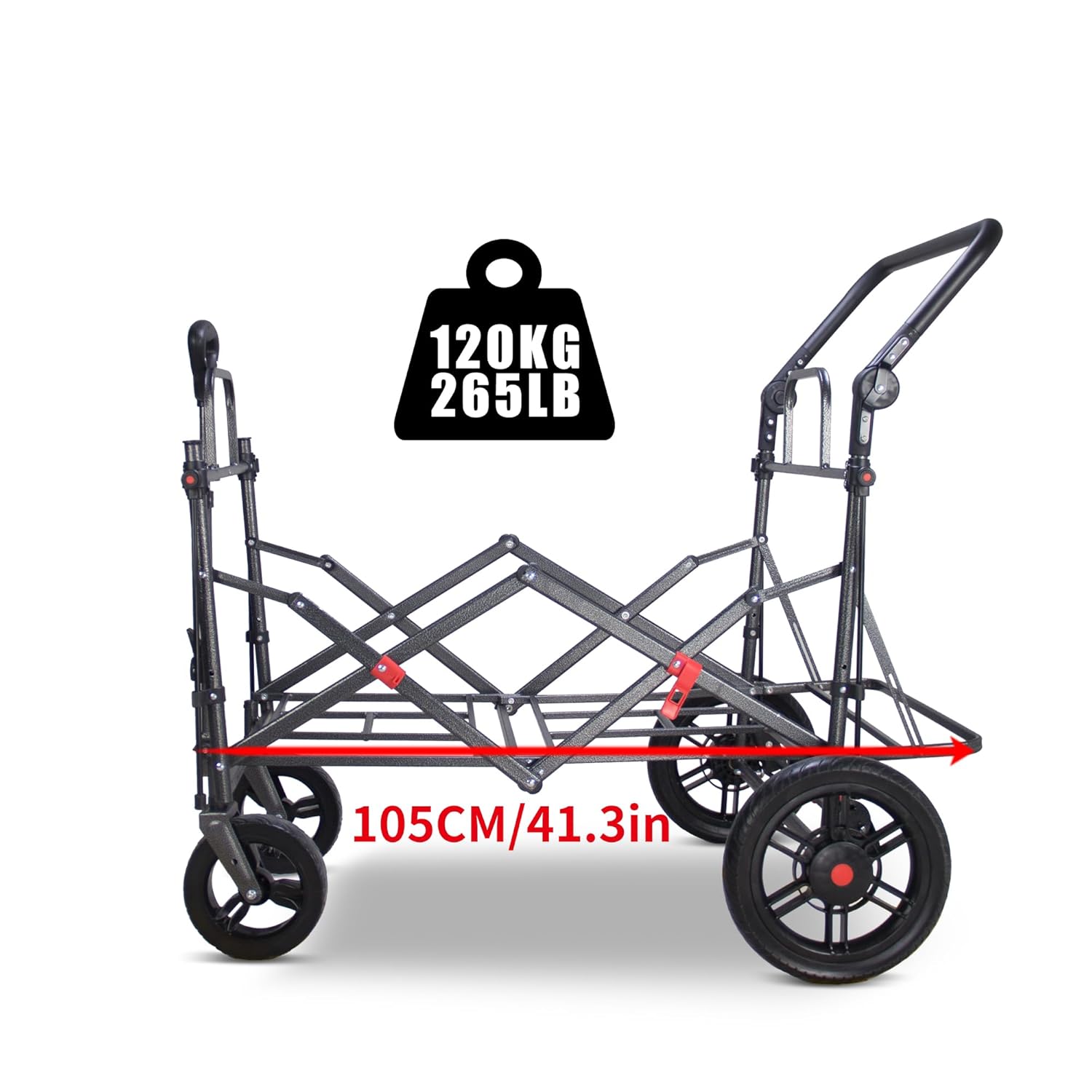 Die 120-kg-Tragfähigkeit macht den Wagen zu einem echten Kraftpaket. Ob Sie mehrere volle Einkaufstaschen, mehrere Koffer oder schwere Werkzeugkisten transportieren – der Wagen bleibt stabil und sicher. Die Lastverteilung ist optimal, sodass der Schwerpunkt niedrig bleibt und die Kontrolle jederzeit gewährleistet ist. Im Gegensatz zu kleineren Trolleys oder Einkaufswagen kann dieser Handwagen echte Schwergewichte bewältigen, ohne zu kippen oder zu schwanken.