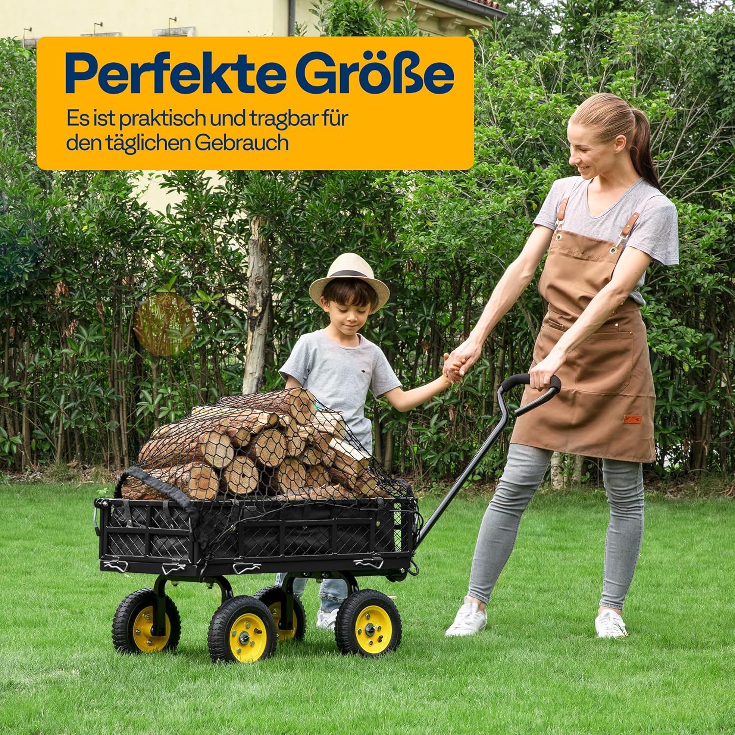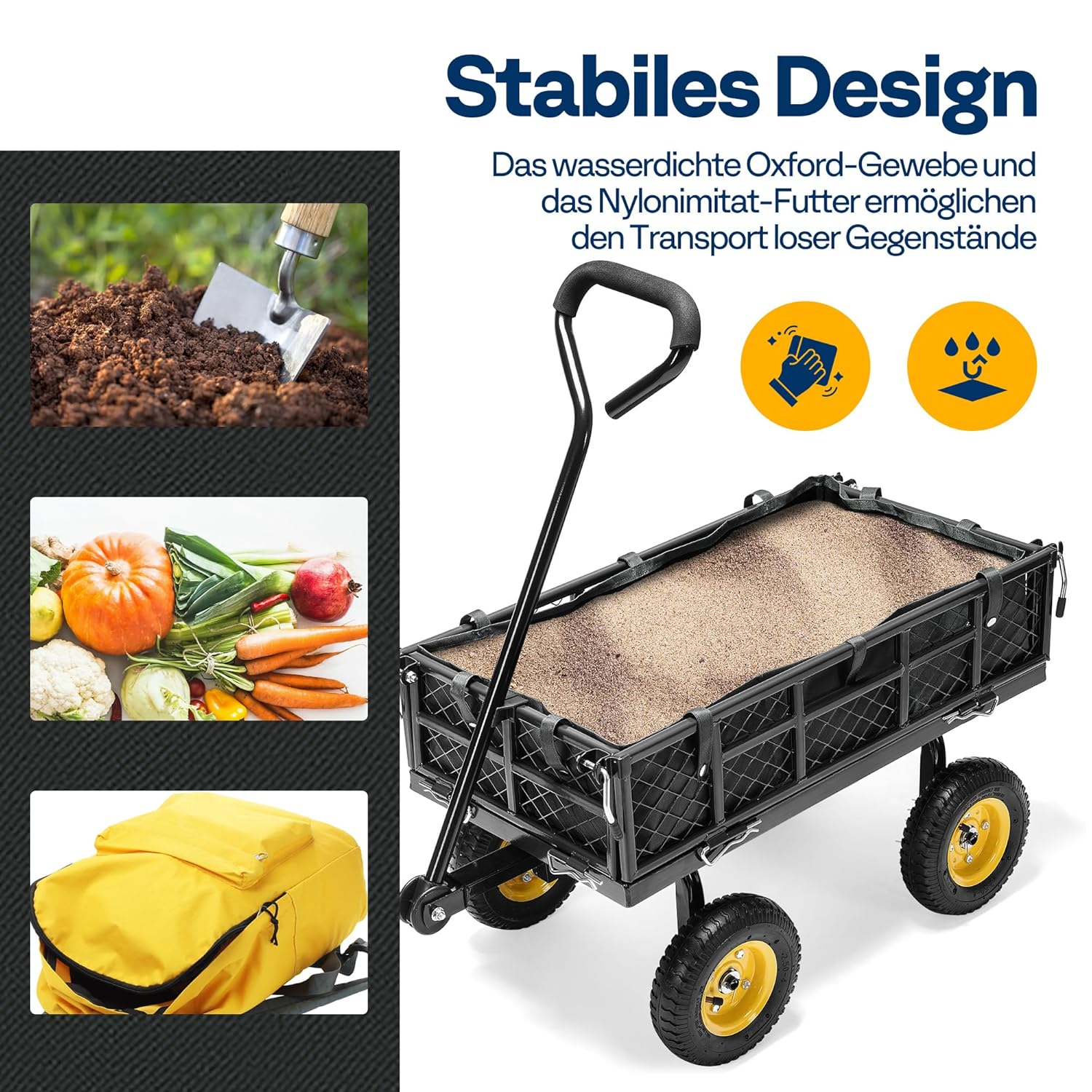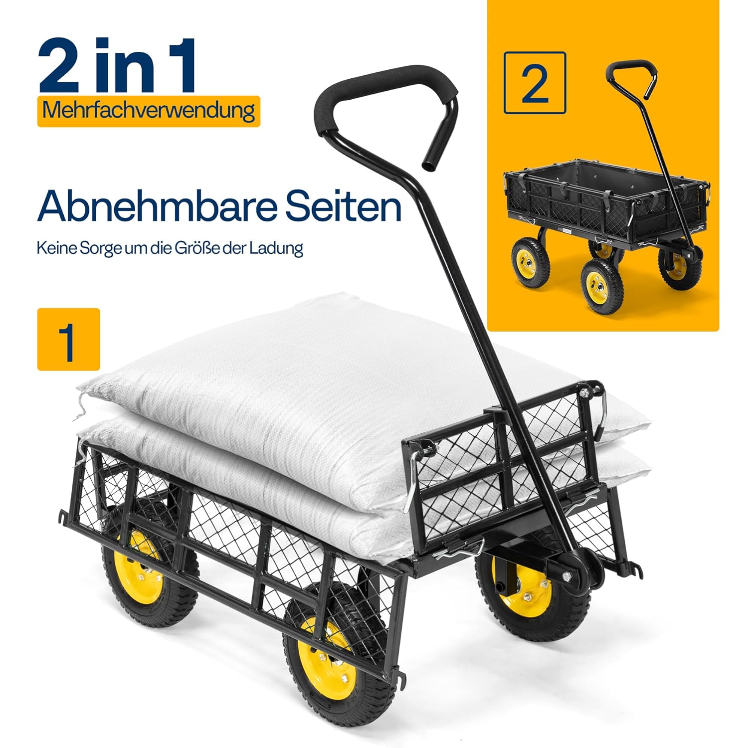 Ein besonderes Highlight ist die flexible Nutzung durch die abnehmbaren Seitenwände. Wenn Sie größere oder unregelmäßig geformte Gegenstände transportieren – etwa ein Fahrrad, eine kleine Gartenbank oder ein Sperrmüllstück – können Sie die Seiten einfach entfernen und erhalten so eine ebene, freie Ladefläche. Dies macht den Wagen zu einem echten Allrounder, der sich jeder Herausforderung anpasst.