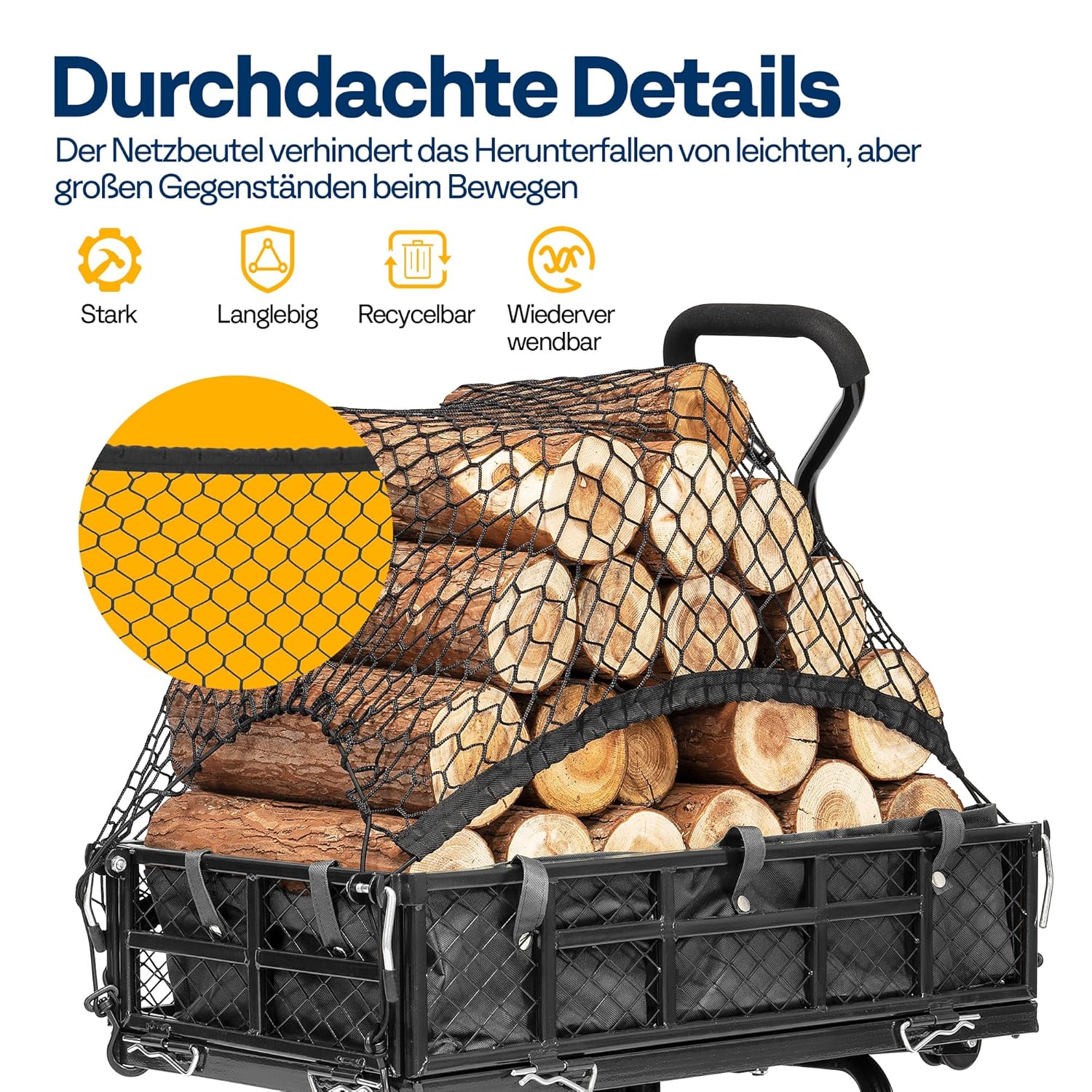 Die Kombination aus wasserdichter Plane und stabilen Stahlmaschen sorgt dafür, dass sowohl flüssige als auch feste Materialien sicher transportiert werden können. Ob Sie nasse Erde vom Komposthaufen bewegen oder Streusäcke zum Auto bringen – nichts verrutscht, nichts tropft, nichts geht verloren.