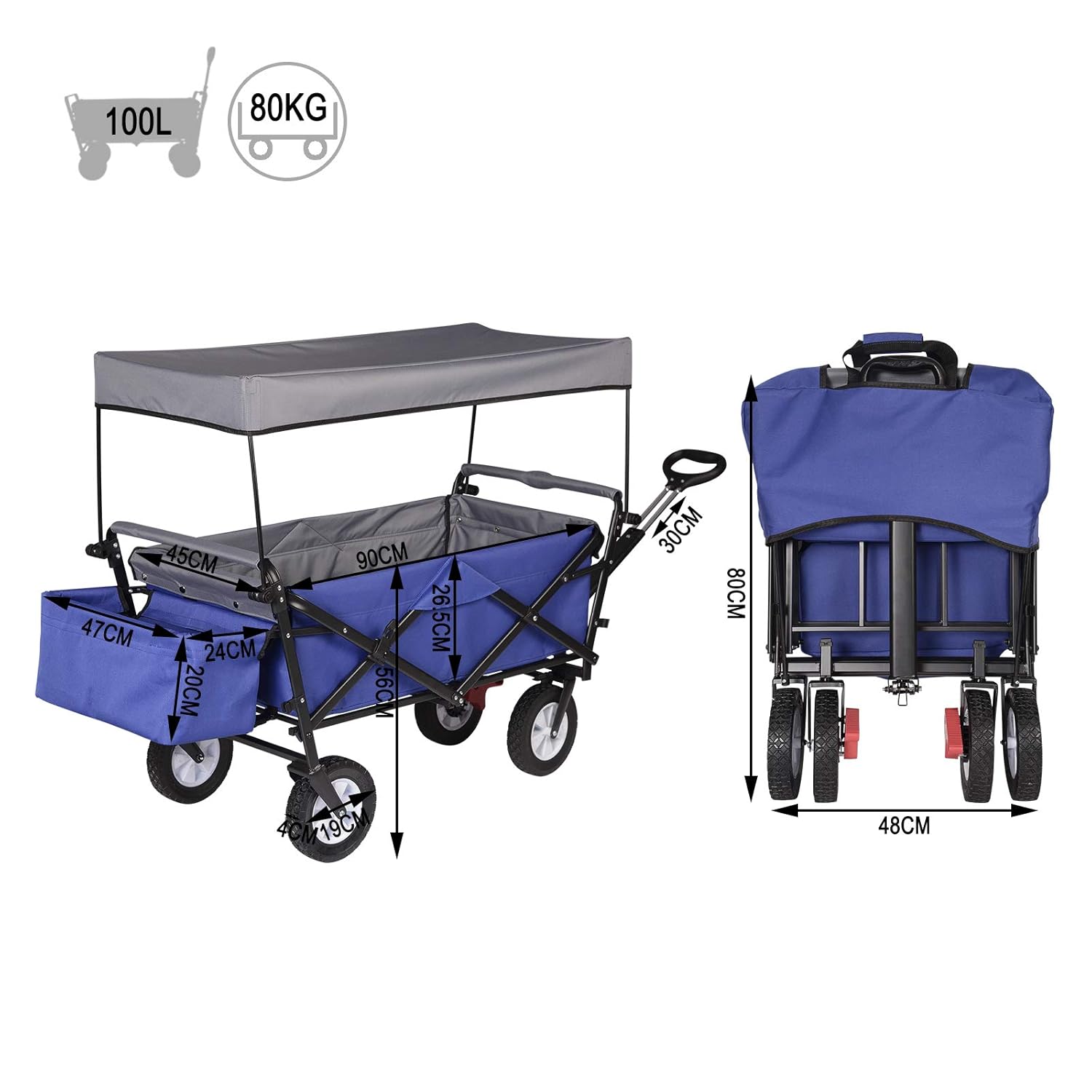 Die Innenabmessungen von 90 x 45 x 26,5 cm schaffen ein Ladevolumen, das in seiner Kategorie Maßstäbe setzt. Mit einer Tragfähigkeit von 80 Kilogramm eignet sich der Wagen für schwere Lasten wie Getränkekisten, Baumaterialien oder umfangreiche Campingausrüstung. Gleichzeitig lässt die Form des Innenraums flexible Nutzung zu – flache Gegenstände, hohe Kästen oder sperrige Ausrüstung finden alle Platz.